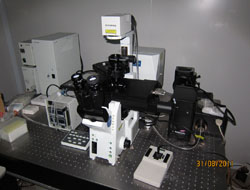 主要技術指標:Olympus BX61倒置顯微鏡通道:3+1,AOTF藍紫激光:405nm Ar離子多線激光器:458,477,488,514nm He-Ne激光:543nm He-Ne激光:633nm;980nm半導體激光器;鏡頭包括10×、20×、40×(oil)、60×(oil)。可三維重建、時間序列掃描。