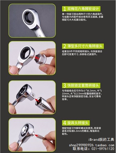 5 ) 組套含快脫套筒轉接頭、與快扳接合后可作為小飛6.3mm, 中飛10mm, 大飛12.5mm輕量級棘輪扳手,轉接頭有快脫鎖定按鈕功能,可牢固地將套筒鎖定,按下松脫鈕后即可快速更換套筒,安全可靠有效率。