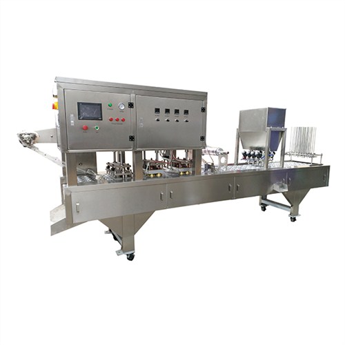 全自動灌裝封口機適用于塑料杯、塑料盒自動灌裝封口。用于綠豆沙,八寶粥,紅豆沙等包裝。全自動操作,自動完成落杯、灌裝、紫外線殺菌、光電跟蹤、日期打印、封口、切邊等。該機采用鋼鐵與不銹鋼制造,結構簡單,操作容易。并且料筒安裝攪拌裝置。 可以根據客戶的需求設計機器。 該機適用于各種塑料杯,碗等材料的灌裝封口,用塑料復合膜或鋁塑復合膜進行熱封和切邊,如魚干、菌類、金貝類、牛奶等盒裝產品深受各地人們的喜愛,經包裝后的產品外形美觀,立體感強。本機設計新穎,結構簡單合理,操作方便,包裝效果較為理想,外部材料采用不銹鋼和鋁合金,符合衛生要求,特別適合中小企業選擇使用。